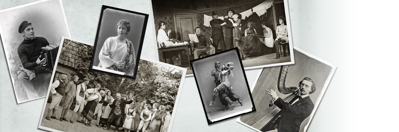 Fotografier från hela den fotohistoriska epoken av personer inom musik, teater och dans. Bland specialsamlingarna kan nämnas Beata Bergströms samling av föreställningsbilder från framför allt Dramaten samt Helledays samling av äldre teaterfotografier.
