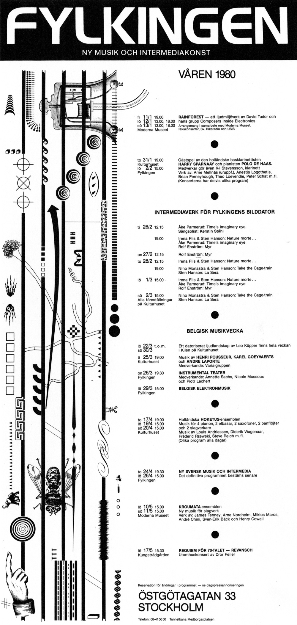 Fylkingens historiska utveckling illustreras här genom ett urval konsertprogram hämtade från Fylkingens arkiv.