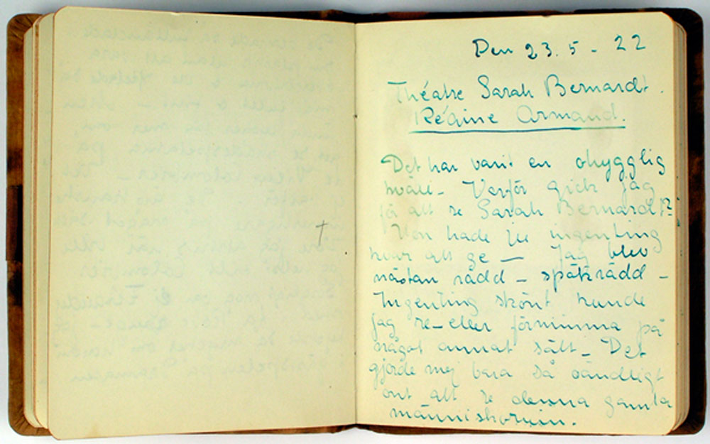 Resan går först till Paris dit hon anländer i maj 1922. Hon ser en rad föreställningar på olika teatrar och skriver om sina intryck. Så här kan det låta: "En comédie i tre akter med förtjusande uppsättning och toiletter. Gudar med vilket humör dessa människor spela: deras ögon gnistra och det ser ut som om de själva hade så gränslöst roligt".