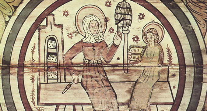 • I högan loft på en stor gård eller kungsgård sitter förnäma personer, och därifrån kan man se vad som händer utanför.